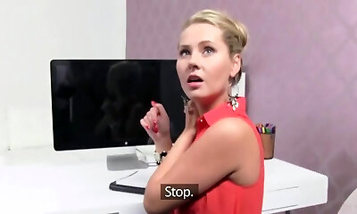 Blonde chick gets fucked during an dialogue by a steaming stud