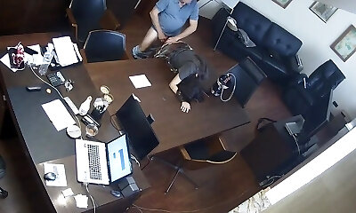 kinky dunkelhaarige assistentin in nylonstrumpfhose ist starr auf dem tisch boinked