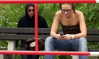Subtitled bizarre Japanese half naked caregiver outdoors