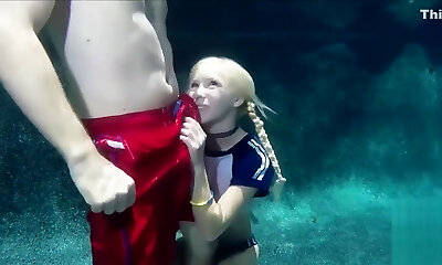 Red head filthy whore deepthroats penis under water in pool