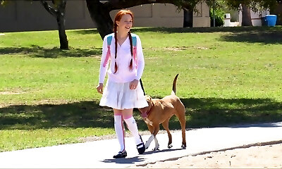 Redhead bombshell goes outdoors only to play around with her private parts