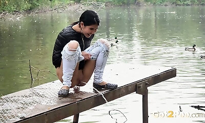 Beautiful long legged brown-haired teen in demins pisses in public places